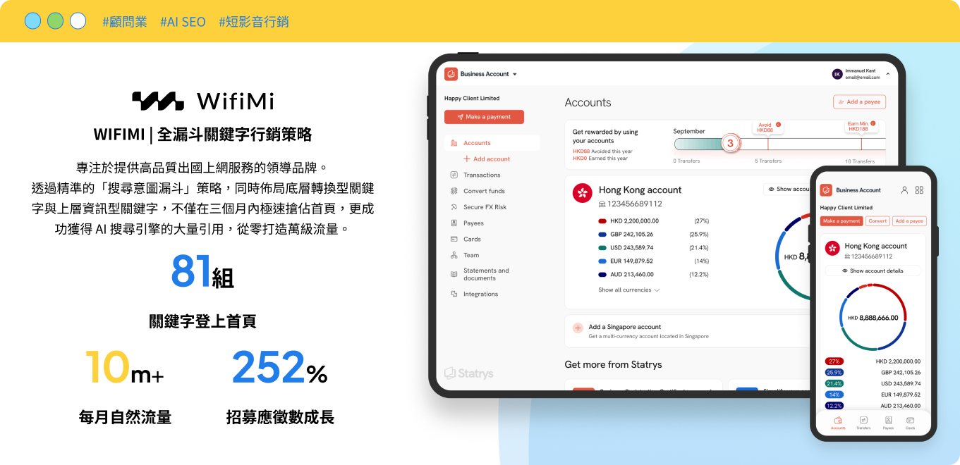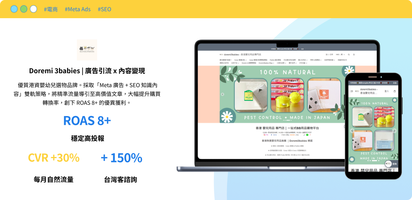 萬智匯縱橫行銷界十餘年,累積多個成功案例,我們的足跡遍及電商、服務業、B2B 製造業等多個領域。從 Google Ads 到 SEO,我們不談虛幻的流量泡沫,堅持只用數據說話,擅長為每一位合作夥伴打造適性化的行銷策略。